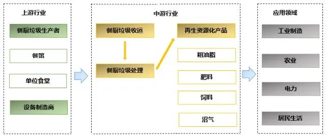 我国餐厨垃圾的处理行业上游是餐厨垃圾制造者,主要是餐饮业和居民家庭为主。下游则是餐厨垃圾处理衍生产品消费者,由于餐厨垃圾处理方式多样,其处理过程中产生的终端产品也具有多样性,常见的有家畜饲料、电力及燃气等。