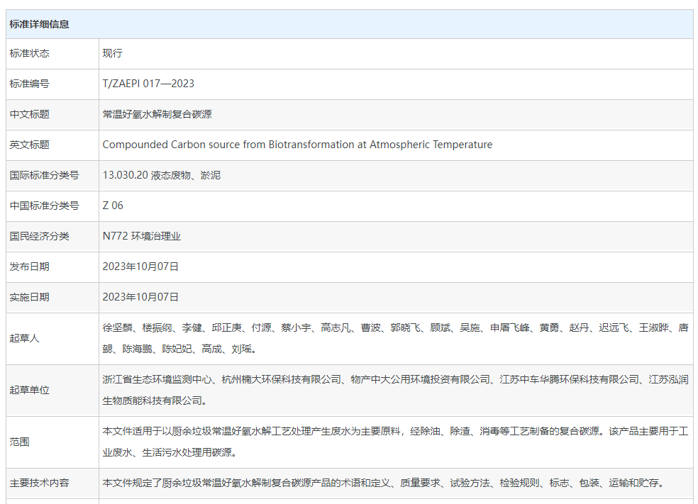 团标规定了厨余垃圾常温好氧水解制复合碳源产品的术语和定义、质量要求、试验方法、检验规则、标志、包装、运输和贮存。适用于以厨余垃圾常温好氧水解工艺处理产生废水为主要原料,经除油、除渣、消毒等工艺制备的复合碳源——用于工业废水、生活污水处理。