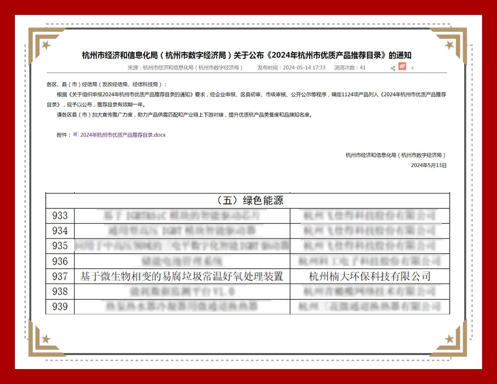 近日,杭州市经济和信息化局正式发布了《2024年杭州市优质产品推荐目录》,豪运国际环保易腐垃圾常温好氧处理设备成功入选!