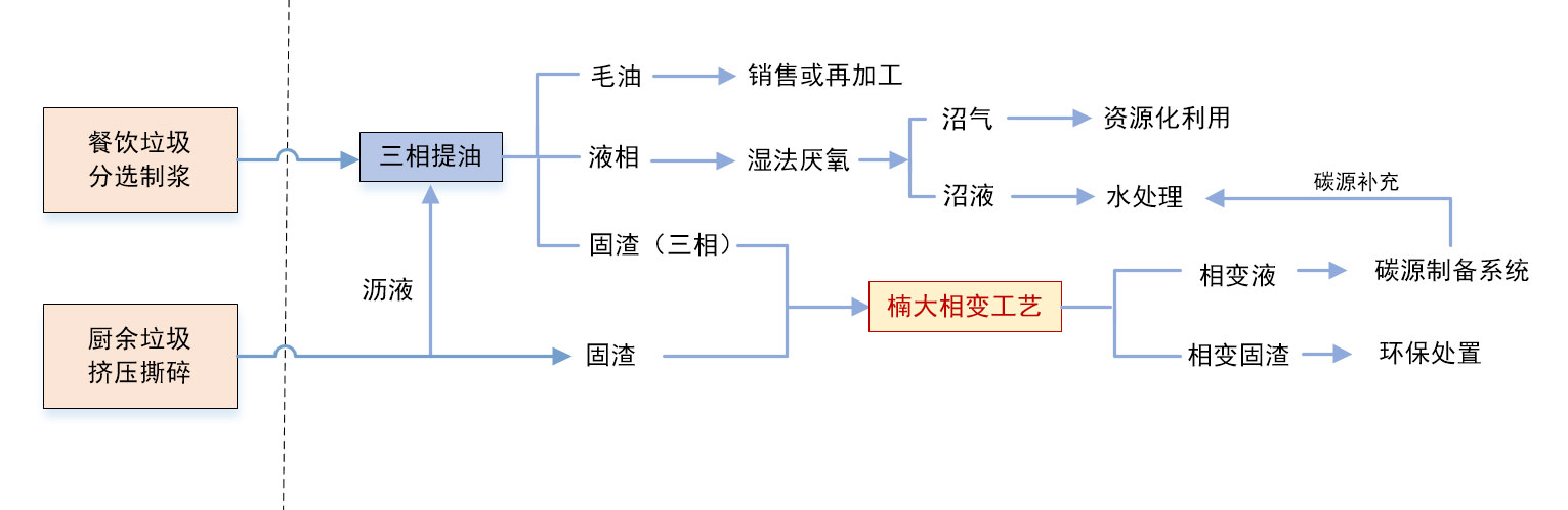 三相分离及厨余垃圾固渣配套协调降解,减少外运焚烧量,为沼液、渗滤液水处理工段补充碳源。